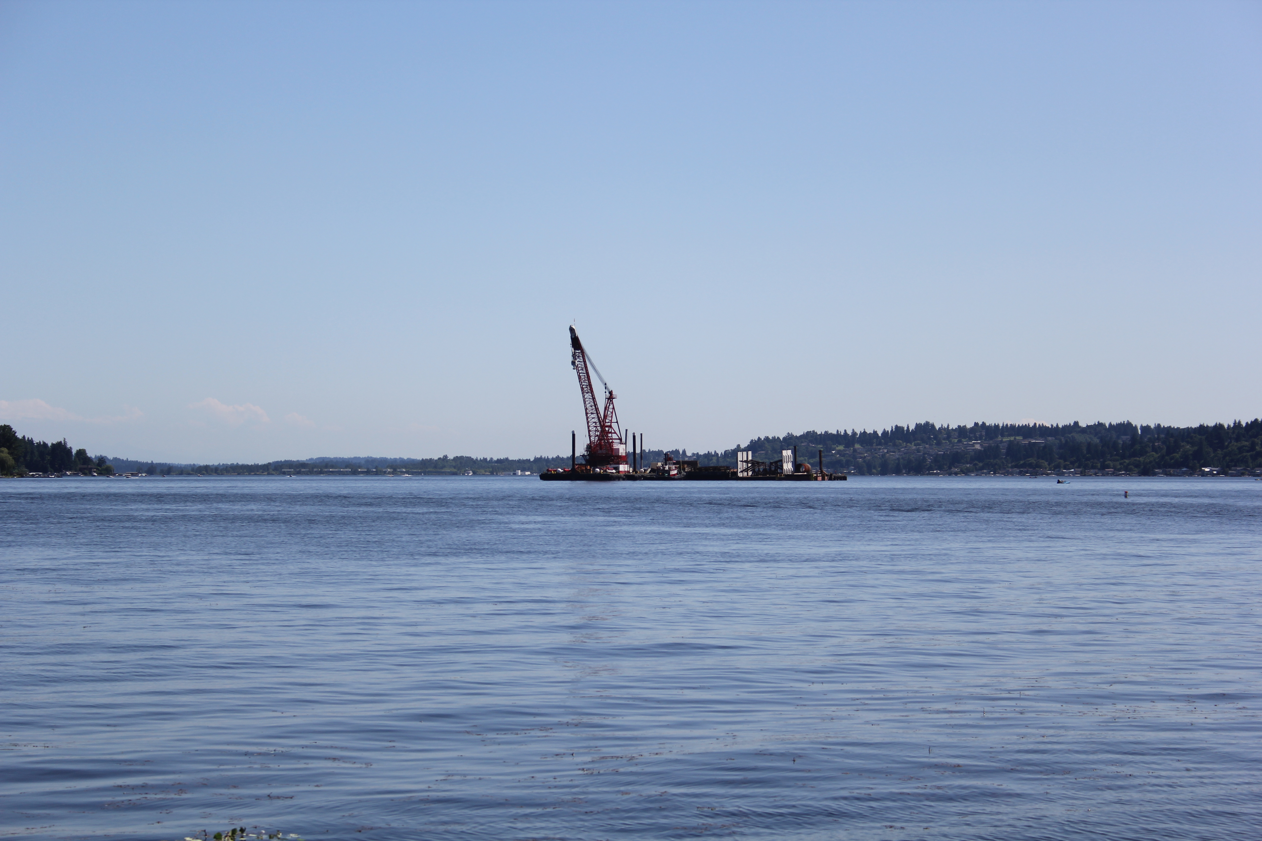 I drive to work, and home from work, I look out at the lake as I go by and see this MASSIVE crane looking thing on a barge out in the middle of the lake –