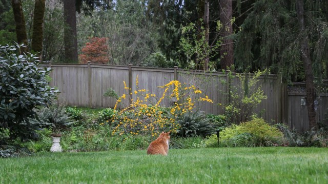 He’s looking for rabbits. Caught one the other day. Stoopid cat.